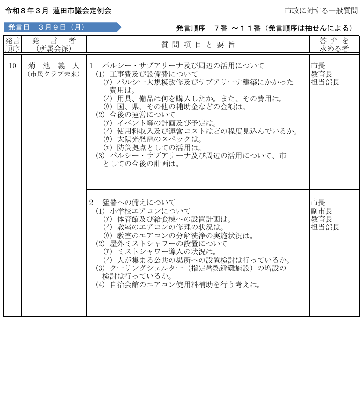令和8年3月議会一般質問 3月9日月曜日の4番目に質問を行います。 4番目ですので、午後になる可能性が高いと思います。 今回は主に2項目で「パルシー・サブアリーナ」、「猛暑への備えについて」です。 パルシー大規模改修・サ […]