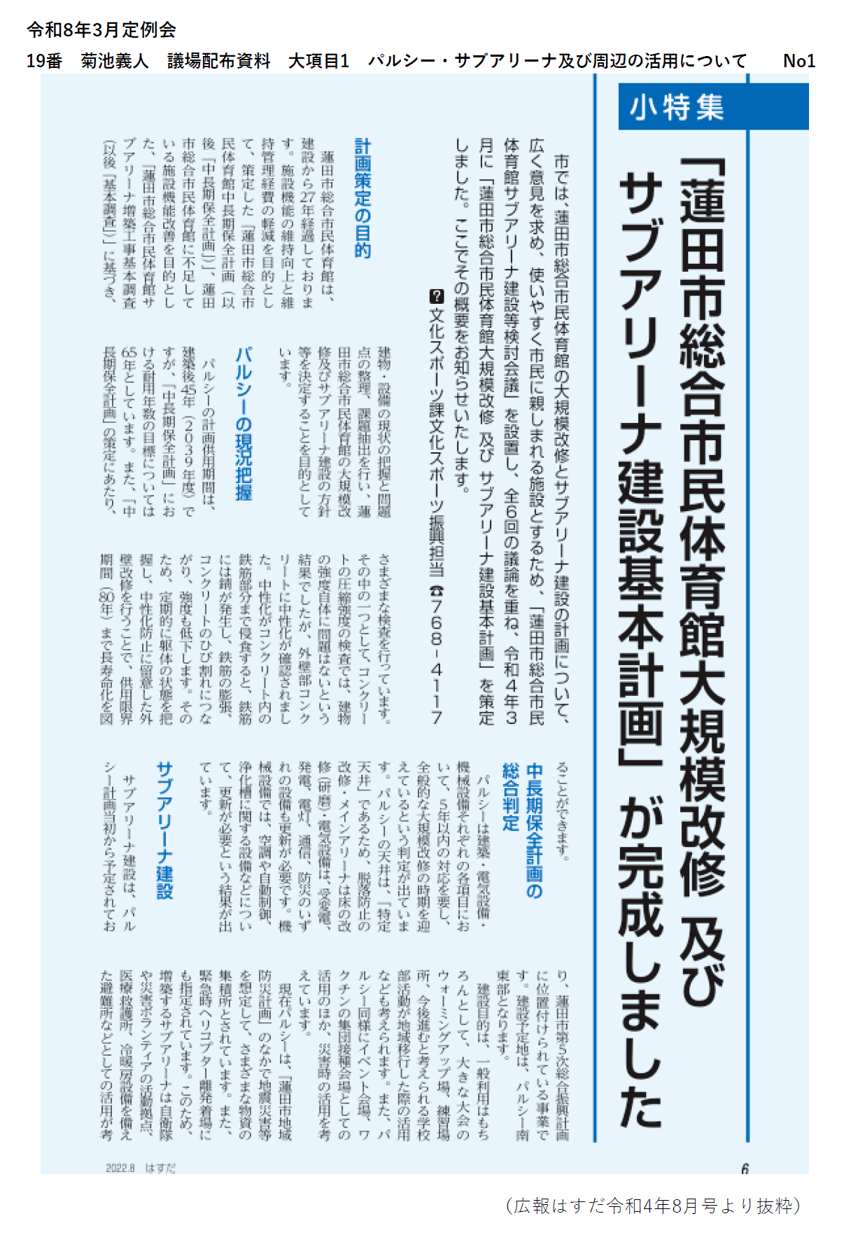蓮田市サブアリーナ建設問題 サブアリーナ建設問題について、何が問題なのかをまとめました。 菊池よしひと が政治活動を通して市民のかたにサブアリーナ建設について聞いてみたところ、多くの市民のかたが「知らない」との回答で、「 […]
