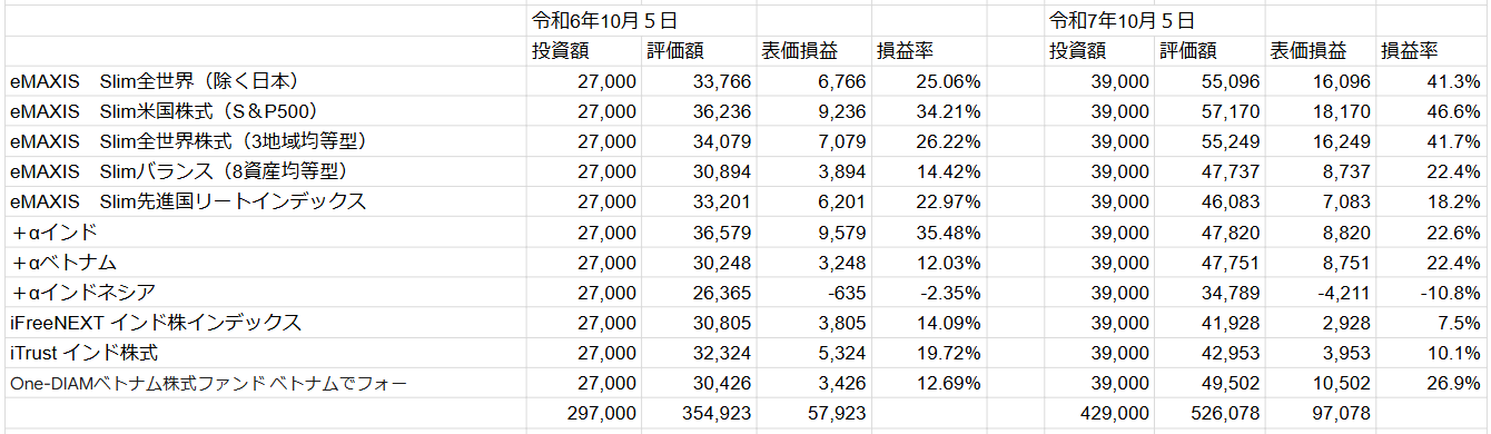 新NISAが始まって約2年が経過しましたがアメリカ及びオールカントリーは相変わらず好調です。インド関連はあまり成長はしていませんが何とか投資額を上回っています。